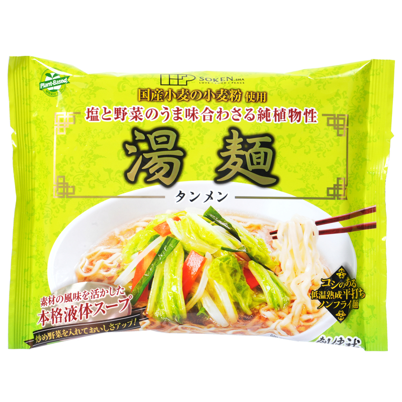 動物性原料(ビーフ・ポーク・チキンエキスはもとより、 魚介エキスさえも)は一切使用してない「生」麺に近いつるつる感と、 歯切れのよい「コシ」の醤油らーめんです。 麺は国内産小麦粉100%で、卵を使わず独自の製法でコシを出した無かん水麺。 揚げ油に100%植物油を使用したフライ麺です。 醤油は遺伝子組換えのない大豆を原料にしており、 安心してお召し上がり頂ける植物素材と組み合わせたスープは 醤油の色と香りを引き立たせて、 さっぱりとしながら深みのある味わいをご賞味いただけます。